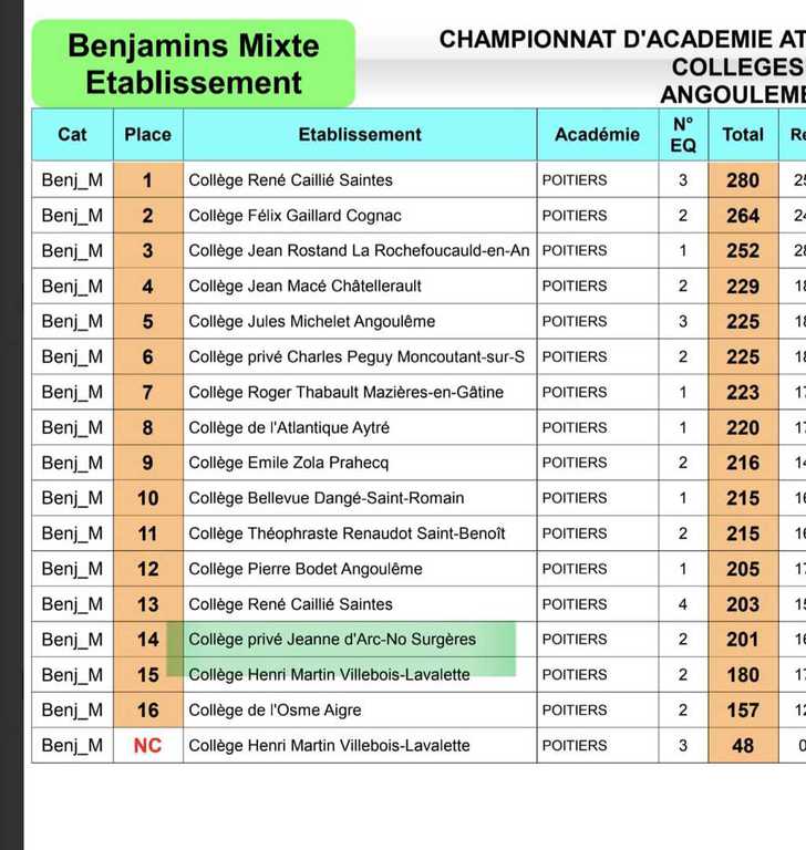 Le mercredi 7 mai avait lieu les championnats académiques d'athlétisme UNSS à Angoulême. Nous avions 2 équipes qualifiées : une équipe mixte Benjamins Benjamines (4 élèves) une équipe mixte