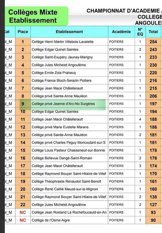 fait preuve d'un très bon état d'esprit. L'équipe des Benjamins Benjamines a terminé 14ème sur 16 avec 201 points et l'équipe des Minimes 9ème sur 22. Le niveau était relevé mais certains élèves se