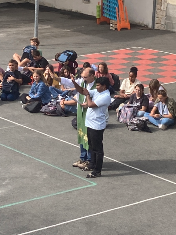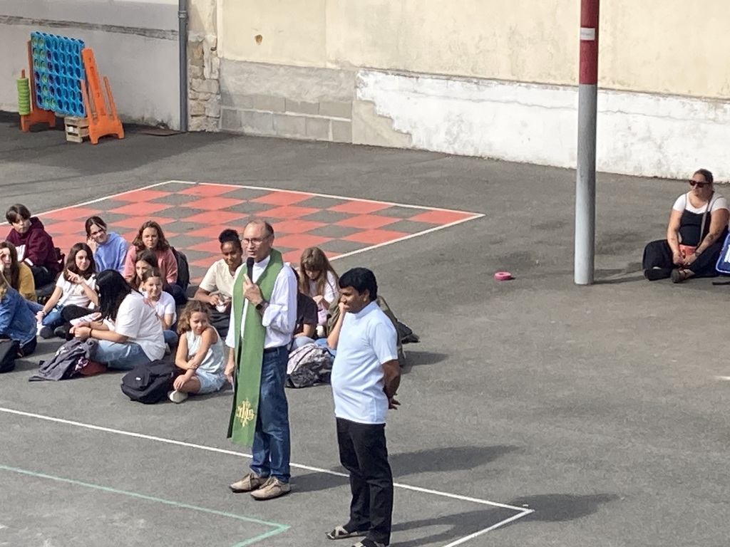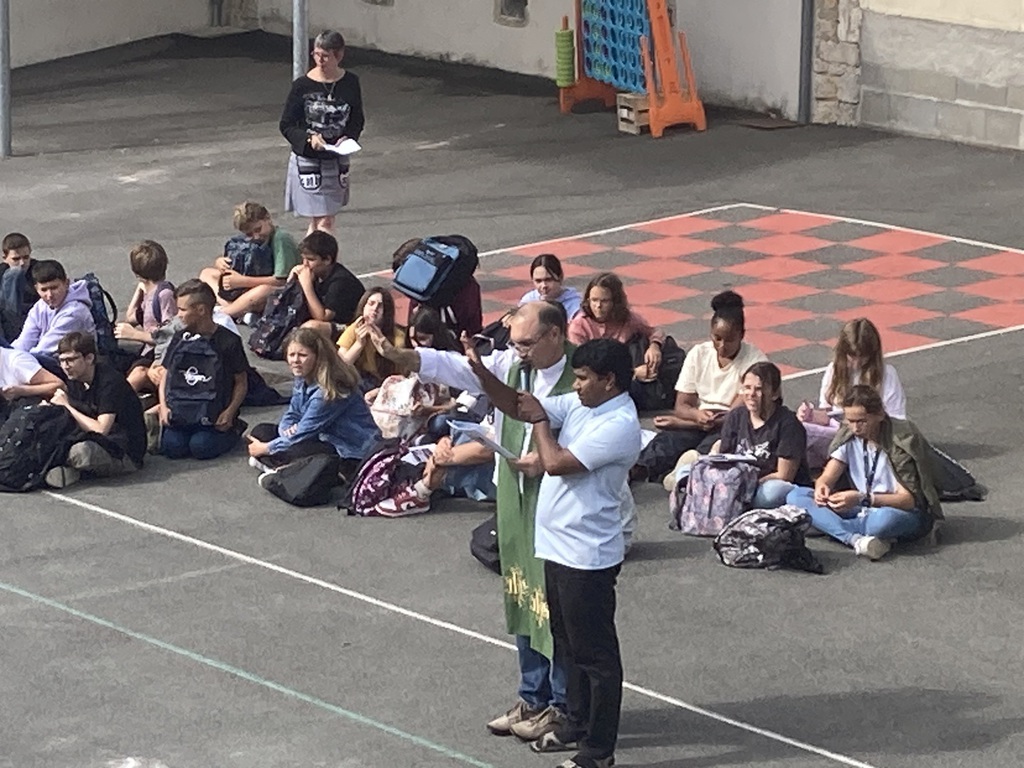 Mardi 3 septembre, le père Martin est venu accompagné du père Alphonse bénir les cartables de nos écoliers et collègiens. Une belle façon de démarrer l'année. A cette occasion nous avons dit au revoir au père Martin qui part pour la paroisse de Rochefort et accueilli le père Alphonse qui devient notre curé. Bienvenu à lui.