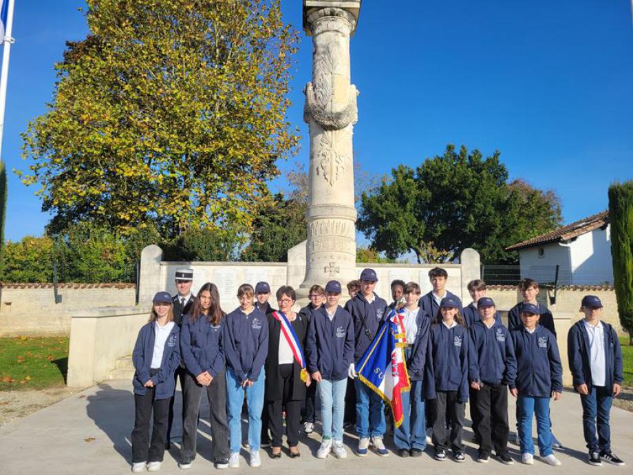 Le 11 novembre, c'est le jour où l'on commémore l'Armistice de la 1ère Guerre mondiale. Si désormais, il n'y a plus de "poilus", le souvenir des luttes pour notre liberté éclaire encore nos forces vives, et demeure un engagement fort pour nos élèves de Classe Défense. La loi du 28 février 2012 étend l'hommage "à tous les morts pour la France" des conflits anciens et actuels. Nous nous souvenons donc avec dignité et honneur de nos grands-pères et arrières grands pères tombés à Verdun, dans la Somme, en Belgique, en Loraine et ailleurs ; mais aussi de nos morts plus récents en Algérie, en OPEX, au Proche-Orient, ou tout simplement sur le territoire national dans des affrontements avec des entreprises terroristes. Mme Desprez, maire de Surgères, lors de cette cérémonie nous a rappelé la volonté du Président de la République que les jeunes générations soient passeurs de mémoire.