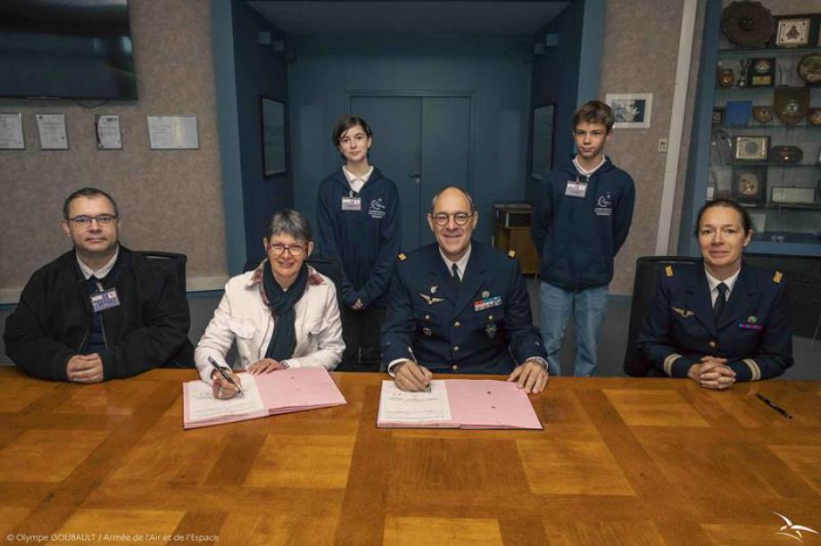 Le 12 septembre, dans la salle "Rafale" du PC de la base 721. En présence du Général Fluxa, nouvellement nommé en juillet dernier commandant de la base école et Délégué Militaire Départemental, ainsi que du Lieutenant-Colonel Simon qui assure notre coordination avec cette unité militaire. Enzo représentant la promotion "Sous-Lieutenant Penverne" (3e) et Camille représentant la promotion "Sous-Lieutenant Mourad" (4e), accompagnés par Mme Mathé et M. Chauviere, ont participé à la signature de la convention 2024-2025 liant notre établissement avec la base marraine. Un moment solennel, où le général Fluxa a rappelé l'attachement de l'armée de l'Air et de l'Espace à poursuivre le lien Ecole-Nation.