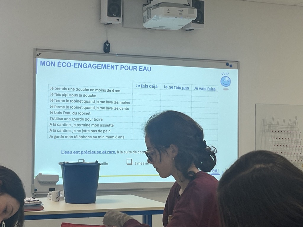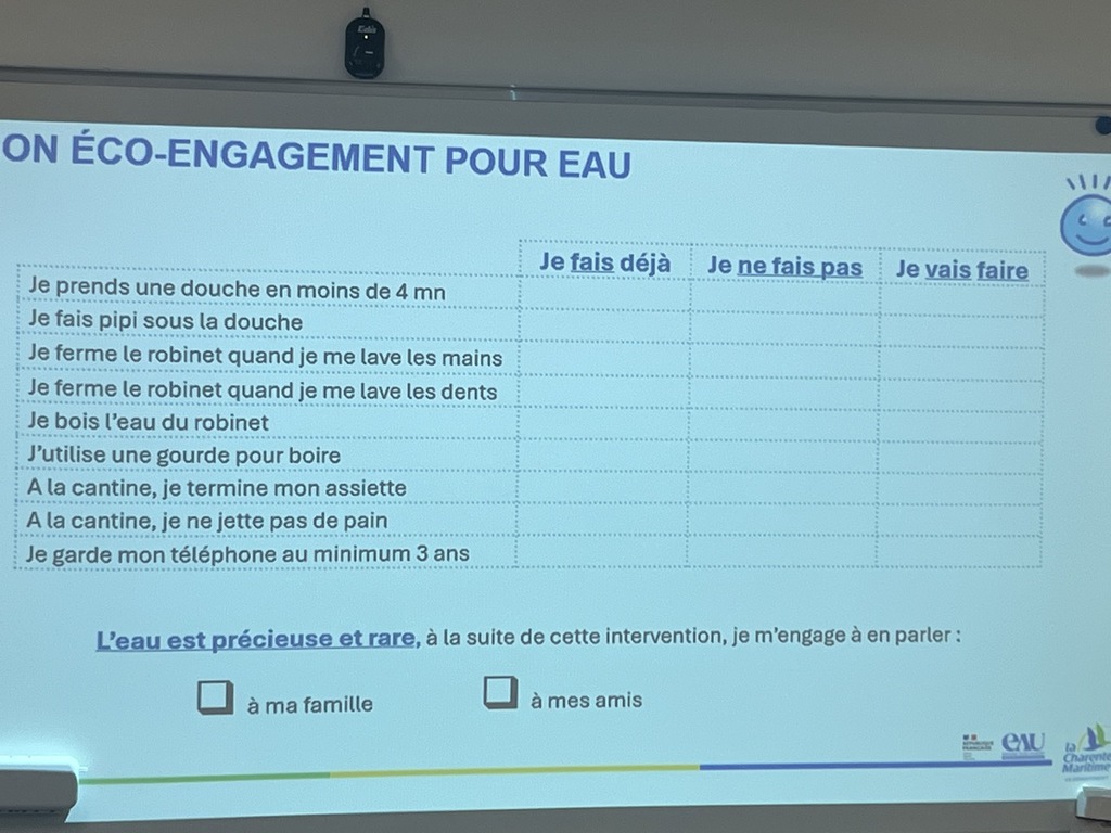 Les classes de 5èmes ont été sensibilisées aux économies d’eau potable grâce à une intervention du Conseil Général de la Charente Maritime, les objectifs étant de comprendre pourquoi l’eau est précieuse, connaitre sa répartition, son origine et le cheminement jusqu’au robinet, identifier la répartition des différentes consommations d’eau et appliquer les gestes de sobriété.